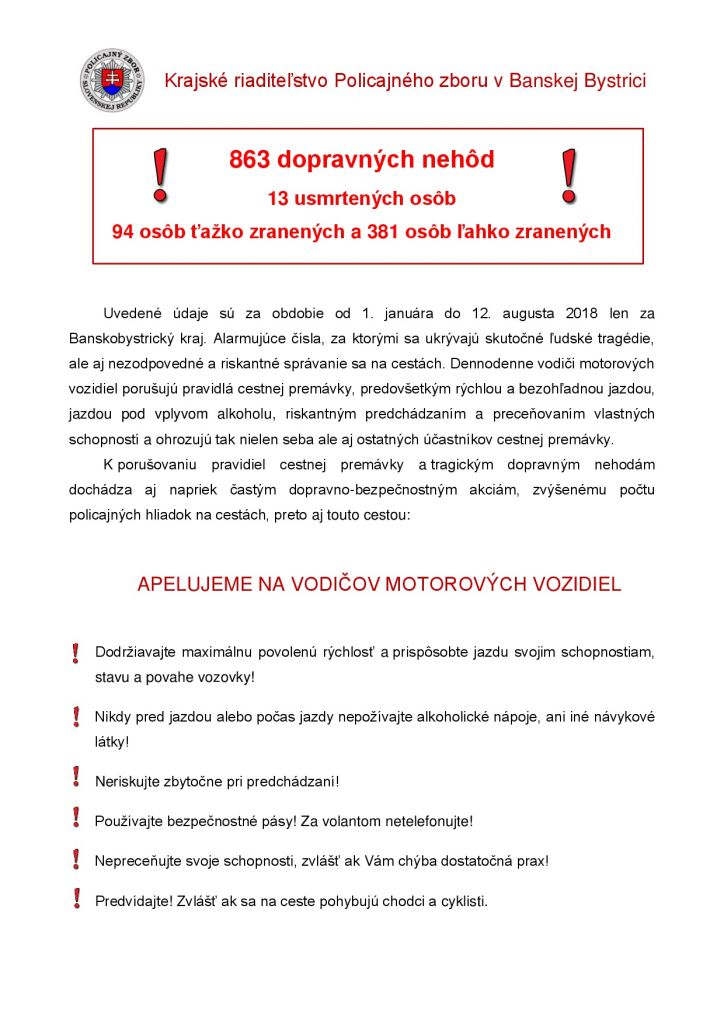 Za obdobie od 1. 1. 2018 do 12. 8. 2018 eviduje Krajské riaditeľstvo Policajného zboru v Banskej Bystrici 863 dopravných nehôd, pri ktorých došlo k usmrteniu 13 osôb, 94 osôb bolo ťažko a 381 osôb ľahko zranených.