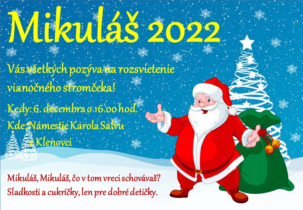 Mikuláš pozýva všetkých na rozsvietenie vianočného stromčeka, ktoré sa bude konať v utorok 6. 12. 2022 o 16:00 hod. na Námestí Karola Salvu.