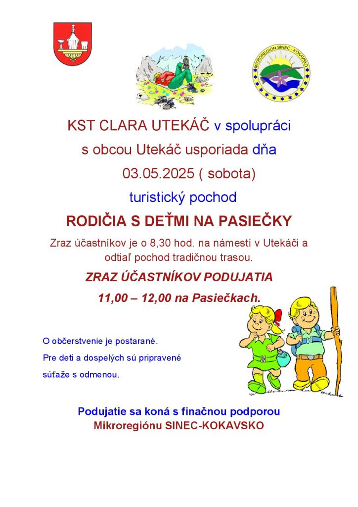 KST CLARA Utekáč v spolupráci s obcou Utekáč usporiadajú dňa 03. 05. 2025 turistický pochod na Pasiečky. Zraz je o 08:30 hod. na námestí v Utekáči