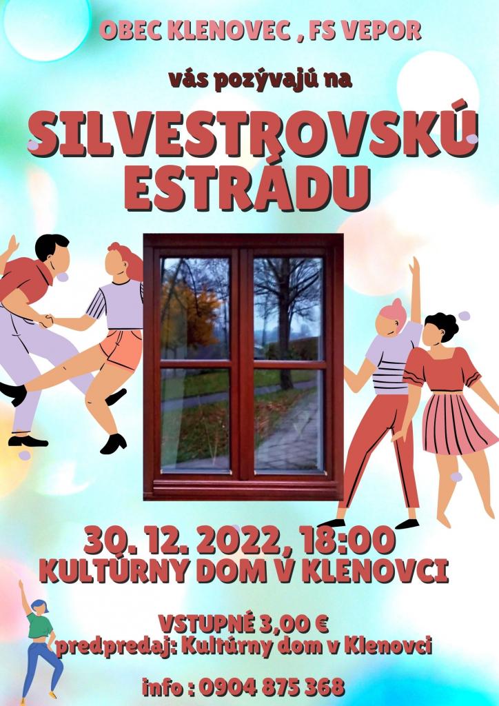 Obec Klenovec a členovia Folklórneho súboru Vepor v Klenovci na známosť dávajú, že všetkých, čo sa radi smejú do kultúrneho domu pozývajú! Kedy: 30. 12. 2022 v piatok, o 18:00 hod. a na šo? No na SILVESTROVSKÚ ESTRÁDU - KLENOVŠAN ZA OBLOKOM! Vstupné: 3,00 €, predpredaj: Kultúrny dom, Jaroslav Zvara, 0904875369.